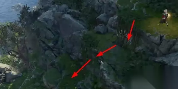 3、沿着石壁一直往前走,然后爬上藤蔓后继续沿着箭头所指的方向移动。