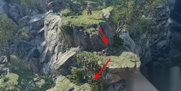 4、到达下图位置以后开始往下移动,跟随箭头一直来到山脚下,回到地面即可。