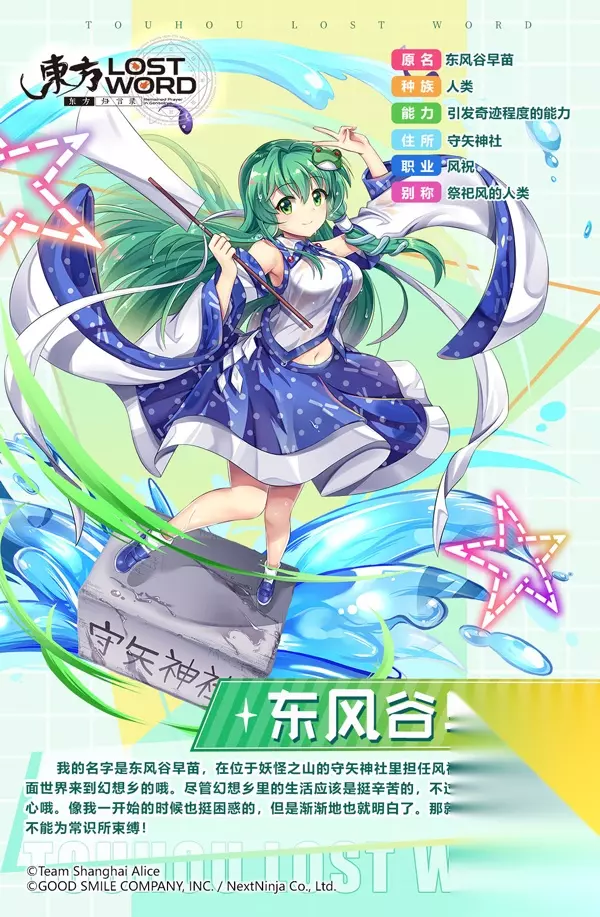 原名:东风谷早苗 种族:人类 能力:引发奇迹程度的能力 住所:守矢神社 职业:风祝 别称:祭祀风的人类 自我介绍: 我的名字是东风谷早苗,在位于妖怪之山的守矢神社里担任风祝。我跟你一样是外面世界来到幻想乡的哦。尽管幻想乡里的生活应该是挺辛苦的,不过你一点都不需要担心哦。像我一开始的时候也挺困惑的,但是渐渐地也就明白了。那就是,在幻想乡里,不能为常识所束缚!