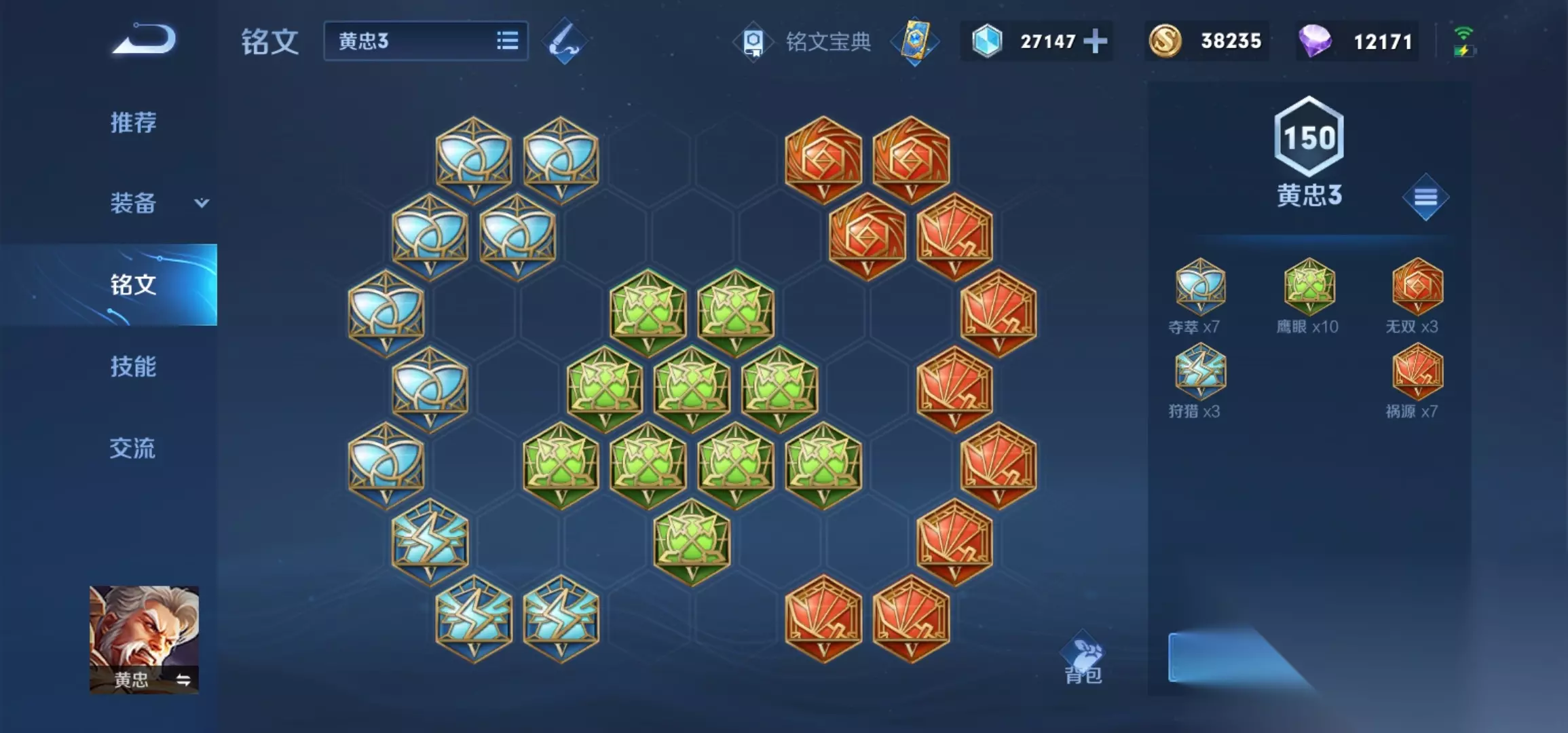 与出装相辅相成的铭文搭配,通常以暴击、物理攻击和物理穿透为主。一套常见的搭配是蓝色铭文选择夺萃提供吸血,绿色鹰眼提供穿透,红色则混合无双与祸源以兼顾暴击效果与暴击率。这样的铭文组合能让黄忠在前期对线时就具备一定的压制力,并完美适配中后期的暴击出装体系,无需在出装中过早追求吸血属性。