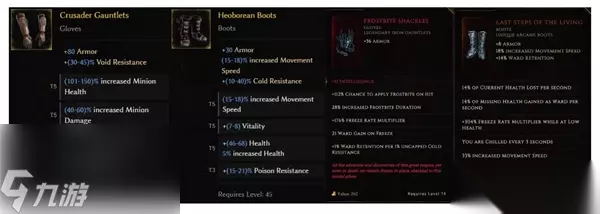 5、手套鞋子 手套的话建议虚空抗基底,前缀召唤物伤害和生命,后缀再补个虚空抗和血量,如果护盾流的话上护盾手套,打孔的话建议智力。 鞋子推荐冰抗基底,能白嫖一点是一点,词缀移速血量和补抗,护盾流换暗金鞋子。