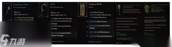 四、装备选择 1、主副手舞曲 第一种双手武器,基底选择较多,补抗或者召唤物伤害都行,前缀不需要,后缀一条近战召唤物伤害提高,另一条是受到的暴击伤害降低(特有词缀),不需要在其他装备上堆暴击避免,解放后缀。 第二种是“剑”盾组合,武器只要个近战召唤物伤害提高词缀,盾牌根据自己装备情况来定,推荐毒抗盾,词缀推荐格挡几率、召唤物生命、全抗(特有词缀)和元素抗。百格盾(荣耀壁垒)也是不错的,但是这是平民bd就只提一嘴。