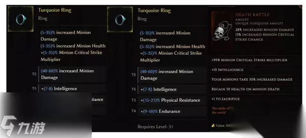4、戒指项链 戒指限定宠物基底(带爆伤不可更换),前缀召唤物伤害和智力,即双增伤(因为召唤物血量其他部位出了,堆到400%~500%召唤物血量提高即可)。 后缀血抗,纯血流可以出耐伤。 项链绑定,宠物爆伤roll值波动较大,个人建议优先roll值,在满足高roll情况下才去找潜能孔,至于召唤物承受更多伤害的负面词条roll值无所谓,基本上大师兄为无敌的存在(相较本体而言)。