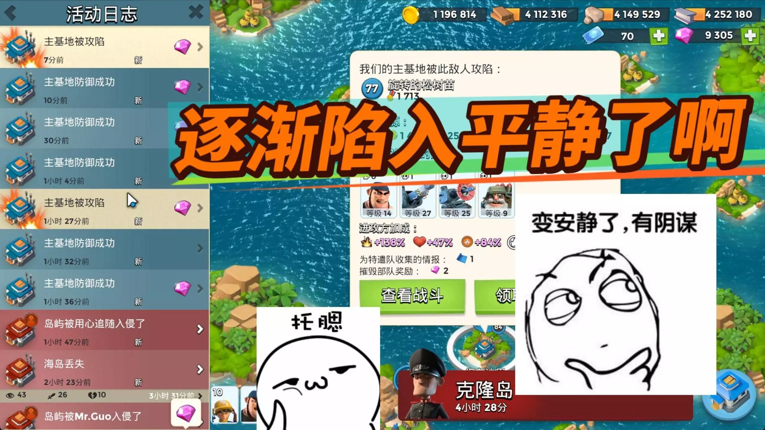 这是手游《海岛奇兵》的冲杯相关内容,玩家分享冲杯实战画面,认为昏沉流派在冲杯里表现比投诚流派更好,还展示了多次基地防御战斗的场景与防御成功的日志。