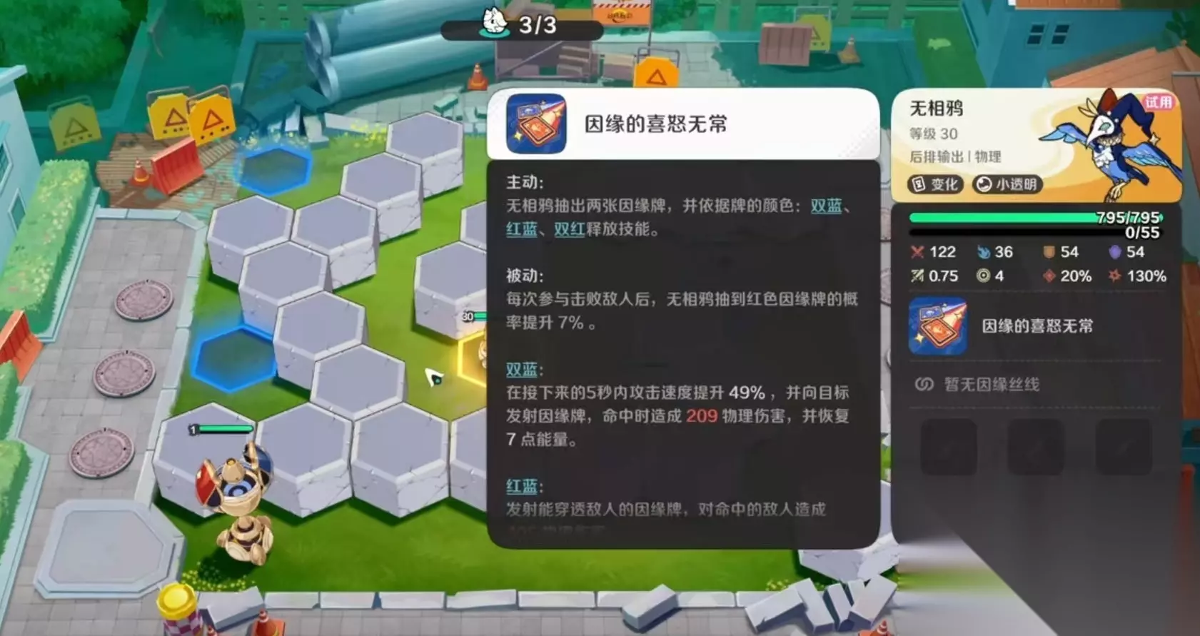 无相鸦是属于变化元理的小透明特性精灵,它的技能姻缘的喜怒无常,是一个非常有特点的机制。主动效果是抽出两张姻缘牌,根据牌的颜色释放技能,一共有双蓝、红蓝和双红这三种情况,也就是对应三种技能效果。被动效果是每次参与击败敌人后,无相鸦抽到红色姻缘牌的几率就能够提升7%。双蓝牌的效果是在接下来的5秒内攻击速度提升49%,并且向目标发射。出姻缘牌命中目标后可打出高额物理伤害并恢复自身起点能量,红蓝效果是发射穿透敌人的姻缘牌,对命中的目标造成物理伤害。双红效果是进入到不可选中状态,发射3张因缘卡牌造成伤害和眩晕。