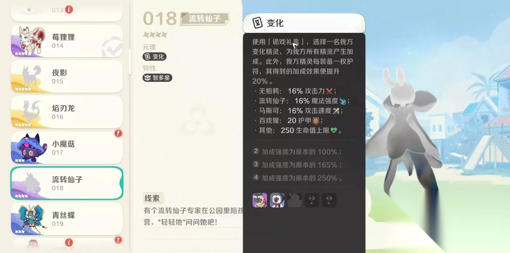 变化原理的特点是使用诡戏礼盒,会选择一名我方变化精灵,为我方所有精灵产生加成,另外我方精灵每装备一枚护符,所获得的加成效果都会提升。对于无相鸦来说,获得的是16%的攻击力加成。所以在阵容搭配方面,大家应该尽量做到触发四变化羁绊可以。选择的队友包括无相鸦、流转仙子、马斯可、百戏猩等,触发四羁绊之后,获得的加成强度就会变成原来的250%,属性大幅度提升。至于其他的队友,尽量争取去触发特性或者是辅助其他的流派也可以接受。