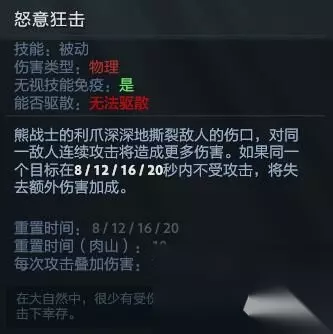 可以看到1级的怒意狂击的buff持续时间仅有8秒,在线上压制能力并不强,因此在三级前,拍拍熊尽量用被动帮助做好前几波兵的正补,线上想要击杀对手最好等到三级之后。 大招:激怒