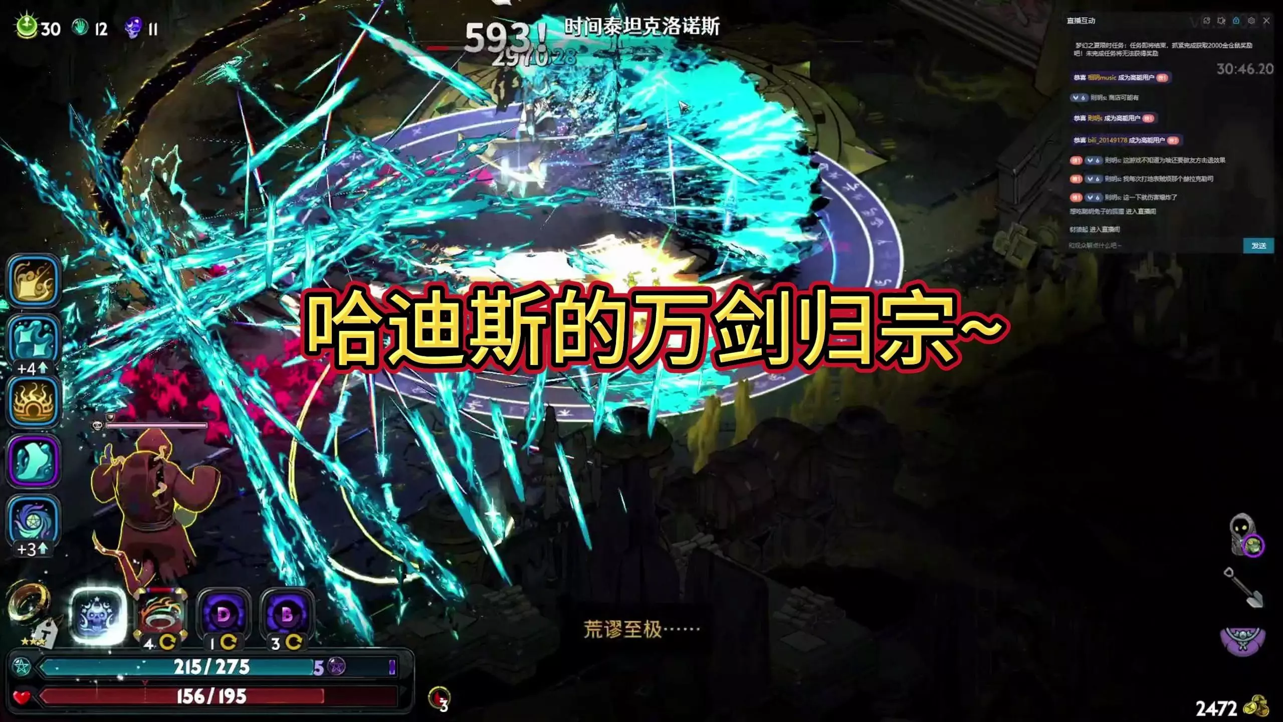 这是《哈迪斯2》的游戏实况,玩家在对局中捡到轮椅道具后,首次成功击败BOSS时间泰坦克洛诺斯,全程没有使用死里逃生技能。