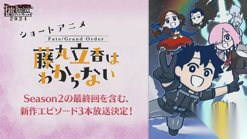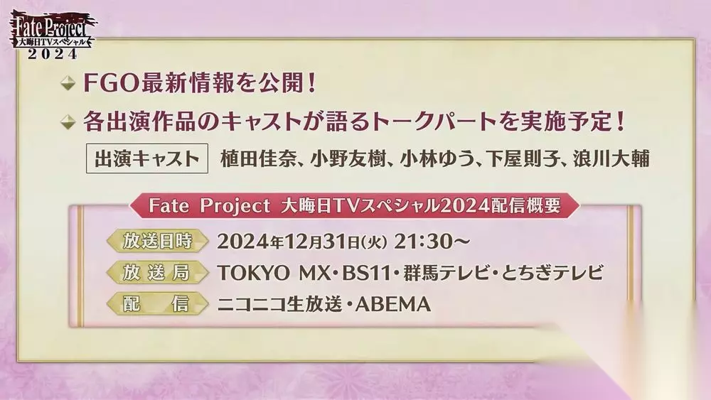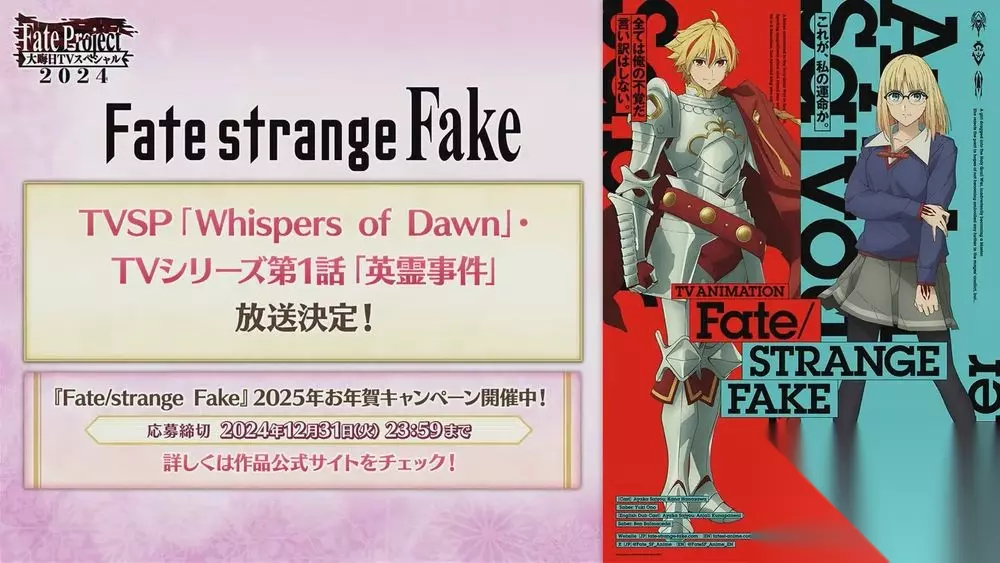 官方即将在 2024 年 12 月 31 日(二)21:30(JST)举办一年一度的「Fate Project 除夕 TV SP 2024」,活动中将会播放电视动画《Fate/strange Fake》第 1 集「英霊事件」、短篇动画《Fate/Grand Order 搞不懂的藤丸立香》第二季最终话&3 部新作,以及带来各出演作品声优谈话环节以及《Fate/Grand Order》最新情报。