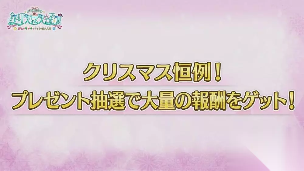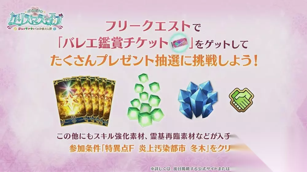 本活动当中,将实施圣诞节惯例的礼物抽选获取大量报酬形式,玩家可使用于自由任务取得的「芭蕾鉴赏券」来抽选富有各种素材道具的礼物;透过消耗礼物抽选获得的「圣诞节成双鞋」还可开启挑战特别关卡,并于通关后取得活动道具。