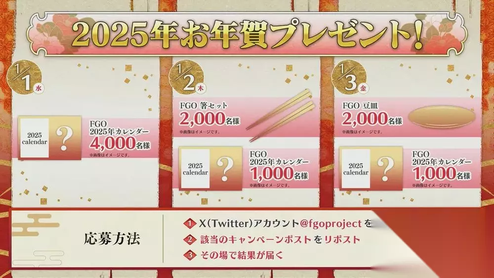 迎接即将到来的 2025 年,《Fate/Grand Order》预告在官方 X(推特)内实施红包礼物活动。活动期间内跟随官方 X(推特)并转发 1 月 1 日~1 月 3 日发布的对应文,即可参加 2025 年月历、筷子 或是 碟子 的抽选。