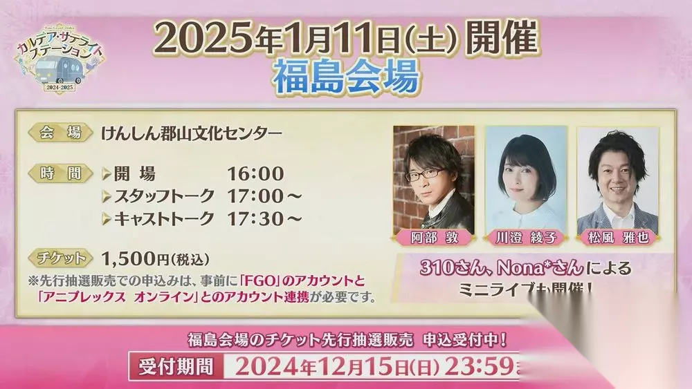 官方预定在 2025 年 1 月 11 日实施「Fate/Grand Order 迦勒底.Satellite Station 2024-2025 福岛会场」,除了公开当地活动特别插图外,也公布演迷你演唱会追加歌手和演唱曲目。