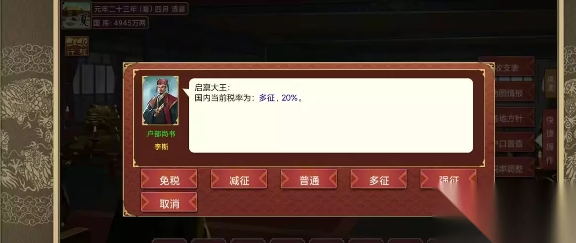 皇帝成长计划2怎么赚钱快?皇帝成长计划2老是缺钱怎么办?皇帝成长计划2怎么挣钱?皇帝养成计划2中在前期积攒财富是非常重要的,钱越多你的城池发展就会越快越好,那么所谓赚钱,无所谓两点,开源与节流,皇帝成长计划2玩家可以先进行巡游来增加民心,然后你的税收就会三柒三三游戏变高,这时候在针对地方进行智能建设,还有就是降低后宫的开销,一般来说赚钱都是没有难度的,但是对于一些皇帝的历史模式,开局只有一两个城池,税收就会特别少,也就成为玩家头疼的问题。小编为大家带来皇帝成长计划2赚钱攻略! 皇帝成长计划2赚钱攻略 1、省钱 其实赚钱首先还是要从省钱开始,可以把后宫除了皇后之外其他妃嫔降为 【选侍】,降低后宫开销,总之赚钱(充盈国库)就只有两种方法,一是靠税收,二是靠变卖宝物。 2、税收 税收就是每季度(两回合一季)上朝时候出来那个提示框,税收是国家最重要的来源,应当在前期一开始就提高税率,一般系统默认的税率是15%,可以提高到20%,高税率所带来的民心下降,可以通过资金扶持解决 民心养足之后,也可以通过特别征税,收割一波…… 每月一定要进行智能建设,可以提高税收