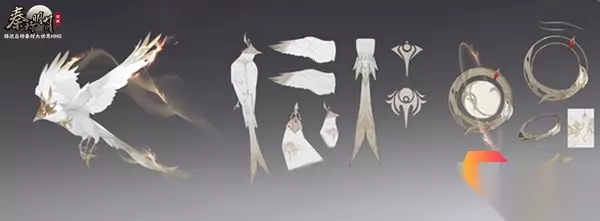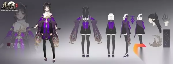 阴阳家服饰: 阴阳家的服饰主色为紫色,以黑白金三种颜色为点缀,黑白意味着对立,紫色意味着神秘。游戏中阴阳家的体型参考了少司命、星魂。服饰上有星空、月亮、三足金乌、火焰这四大元素,袖子尾部可以看到明显的羽毛元素,长袜和手套则是北斗七星的元素。