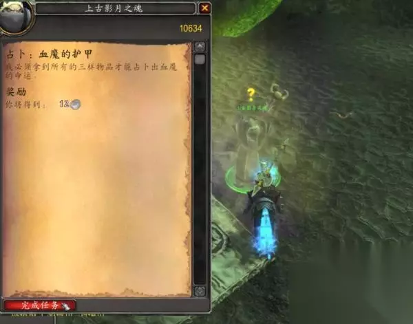 4、返回暗影祭坛(坐标58,71),找到NPC上古影月之魂,提交任务“占卜:血魔的护甲”并获取奖励。