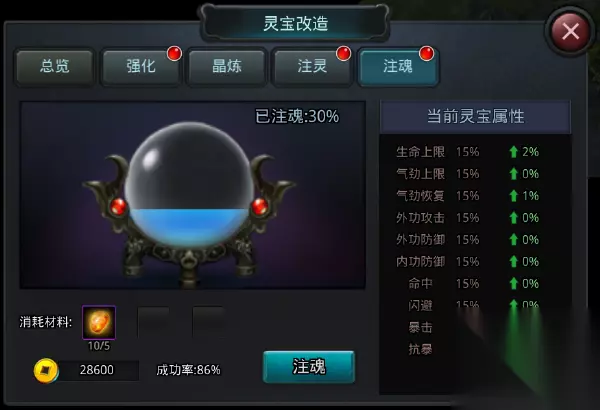 【灵宝注魂】: 消耗相应材料可以对灵宝进行注魂,与注灵类似,注魂程度越高,灵宝加成的属性也越高。不同的是注魂是按百分比提升灵宝的属性。