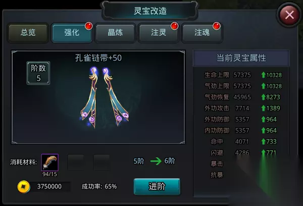 【灵宝强化】: 消耗相应的强化材料以及银两,有一定的概率提升灵宝等级,灵宝等级提高,加成的属性也会随之提高