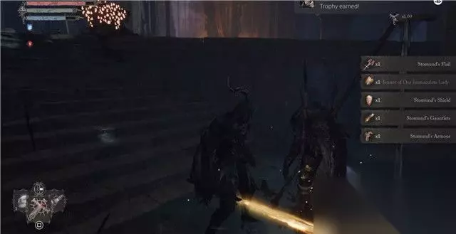 4. 打通神圣修女修道院后,再次前往之前在“神圣修士庄园”尽头位置遇到斯托蒙德的地方找他。 这次他将送给你【斯特蒙德的连枷】,【斯托蒙德的护甲】和【斯托蒙德的盾牌】。 当你前往下一张地图“忏悔之塔”后,将在塔楼右侧的一片区域找到斯托蒙德的尸体,从他尸体上你可以拾取他额外的装备【斯托蒙德的铁手套】以及【我们完美女神的旗帜】。 (注意,如果你在到达“忏悔之塔”前,没有交付给他那两样他想要的物品,斯托蒙德将会永久消失,这也就意味着你的这条支线失败。) 5. 注意,如果你之前没有交付斯托蒙德那两样他需要的物品,这里将不会捡到旗帜。 只有当你捡到这个旗帜物品,才算是完成他的支线任务,并解锁对应的支线成就“忠诚者”。
