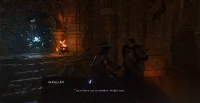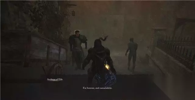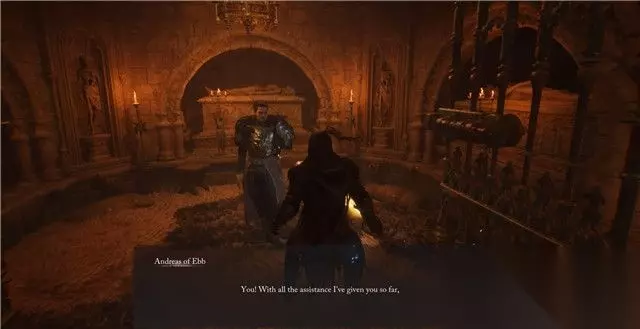 8. 将家谱交给安德里亚斯后,他会一本正经的告诉你在以后的战斗中,有事可以叫他进行支援(实际上,只是虚假的客套话)。 9. 当你在游戏末尾,重返卡拉斯上层时,路过竞技场后将会遇到他。(这件事一定会发生) 这次安德里亚斯摊牌了,他想要你手上的提灯,软硬兼施多次后发现并没有得逞。 当你打败安德里亚斯后,将会获得他的套装。 按照以上步骤完成这条支线,将使你解锁对应的支线成就。