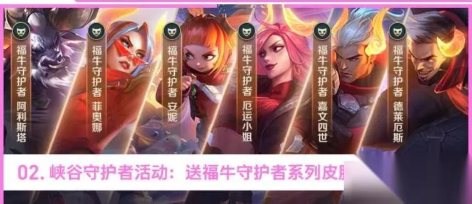 峡谷守护者活动介绍 1、该活动是LOL国服不删档测试的福利活动之一,一共有六个阶段。 2、每个阶段的皮肤都不一样,而且是依次开始的,玩家在活动期间完成所有的任务可以获得所有的福牛活动皮肤。 3、六款皮肤包括牛头、剑姬、皇子、诺手、女枪和安妮,第一款是安妮,需要玩家对战十局。