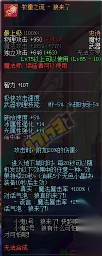 拥有两个强大的buff增加1000点智力或者12%的魔法攻击力,但是因为技能的冷却时间不一样所以会有空挡,同时因为是法杖所以攻速也比较慢,但是并不影响这把武器的地位。 4、牧童之谎-狼来了