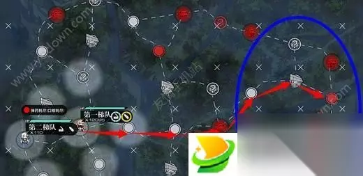 打法路线: 简单说,就是两个梯队走中路,出门入上图所示; 第一梯队前进到中间的红色机场位置,中间记得部署第三梯队;大概率在右上方 如果运气好,BOSS会出现在右下方位置; 如果没出现,就沿着红色箭头继续前进即可;最不济可能BOSS在下方,那么继续往左下走即可。 中路过去机场前1个点可能就遇到铁血,这时候打掉,然后左边机场部署第三梯队,之后就还是上面的套路,右边探索Boss即可。