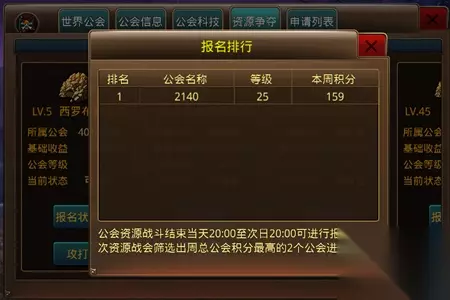 公会资源站报名信息: 玩家找到游戏页面活动按钮内的“资源战”。 在公会页面最上方的“资源争夺”切换标签中可查看世界各黄金矿的报名情况。