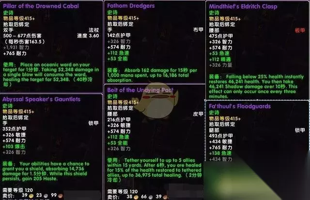 6、法索乌的潮汐卫士(锁) 血量90%以上时,你的攻击有几率对目标推波造成3677冰霜伤害。血量低与90%时,你的攻击有几率恢复5534生命值。着特效完全是核心的存在! 7、异常海潮贤者的裤子(皮) 你的技能有几率召唤一个风暴,持续10秒,每2秒治疗为你恢复1225点。过量治疗会变成自然伤害弹射到附近的敌人。