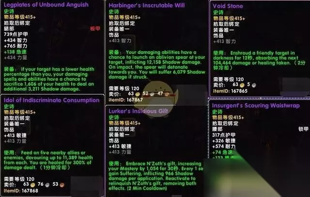 17、饥不择食(饰品) 吸收周围5个盟友或敌人,每个目标吸取8625点生命,你会受到3倍的治疗量。这真的是敌我不分,饥不择食,开团的时候躲远点,不知道什么时候被咬一口! 18、潜伏者的狡猾礼物(饰品) 拥抱恩佐斯的礼物,增加1054点精通,持续30秒,拥抱的时候还会造成痛苦,每秒造成966点暗夜伤害。再次使用放弃恩佐斯的礼物,失去精通加成也失去痛苦!