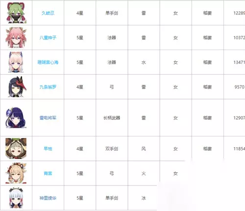 久岐忍、八重神子、珊瑚宫心海、九条裟罗、雷电将军、早柚、宵宫、神里绫华 4、须弥女角色