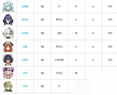 珐露珊、莱依拉、纳西妲、妮露、坎蒂丝、多莉、柯莱 5、其他女角色