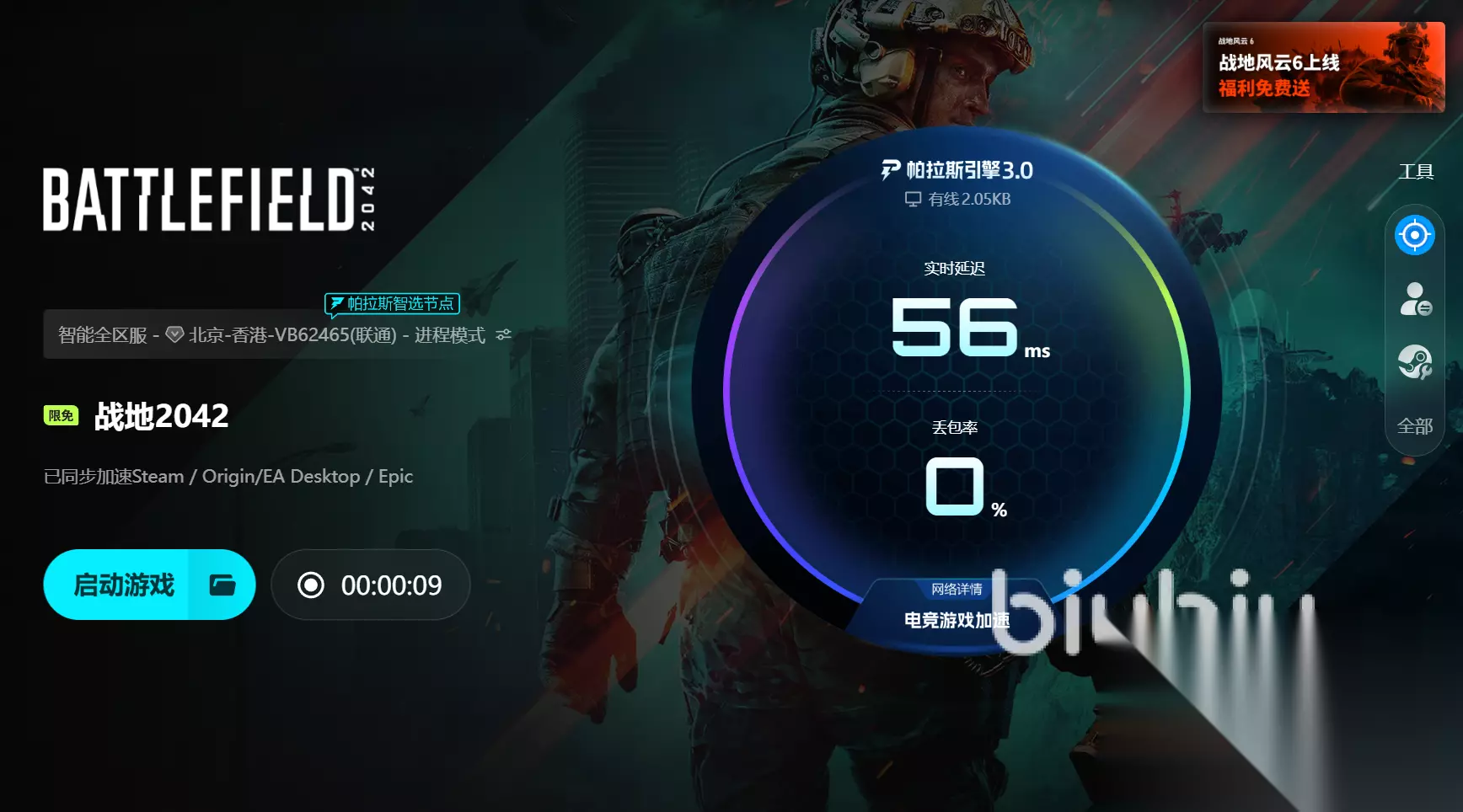 操作方式非常简单。打开biubiu客户端,选择战地2042并点击开启。系统会自动识别并连接到最佳节点,无需手动配置。后台运行轻量,不占用系统资源,也不会拖慢帧率。几秒钟内网络便能打通,重新启动游戏时即可快速登录,告别卡在加载界面的等待。加载条流畅推进,伴随熟悉的音乐声,游戏体验立刻恢复顺畅。