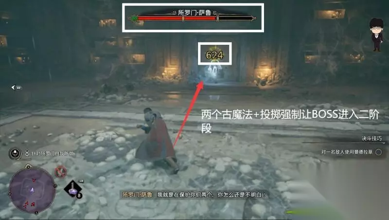 与所罗门的这场BOSS战难点在于阴尸的加入,起手破黄盾,上去就是一套连招接两个古魔法可以快速让所罗门进入下个阶段,利用投掷物破锁血,接着回头赶紧清理阴尸