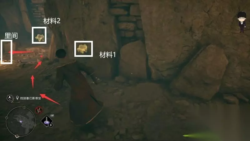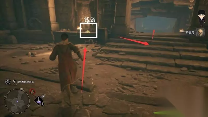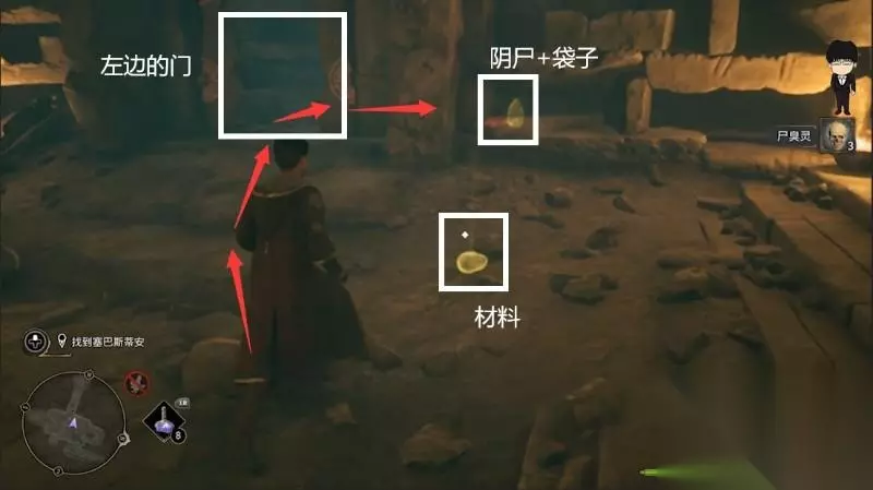 打完与奥米尼斯一段对话后,打开左边废墟的入口进入,右边有袋子和钱袋,左边有袋子记得拿上
