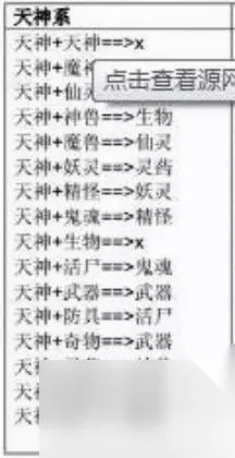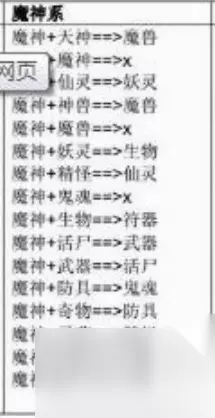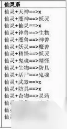 5、精怪配方: 天神 鬼魂;魔神 灵药;仙灵 鬼魂。神兽 防具;魔兽 活尸;妖灵 活尸。鬼魂 灵药;活尸 奇物;活尸 符器。 6、鬼魂配方: 天神 活尸;魔神 防具;仙灵 活尸;仙灵 灵药;魔兽 生物;精怪 活尸;生物 活尸;防具 灵药; 7、生物配方: 天神 魔兽;魔神 妖灵;魔神 符器;仙灵 神兽;神兽 精怪;魔兽 武器; 妖灵 精怪;妖灵 防具;精怪 武器;活尸 灵药; 8、活尸配方: 天神 防具;魔神 武器;神兽 灵药;妖灵 生物;鬼魂 生物;