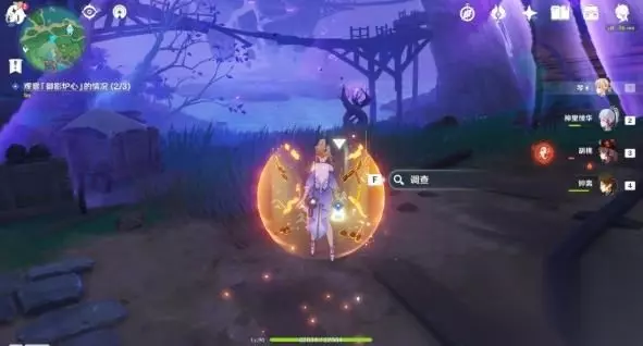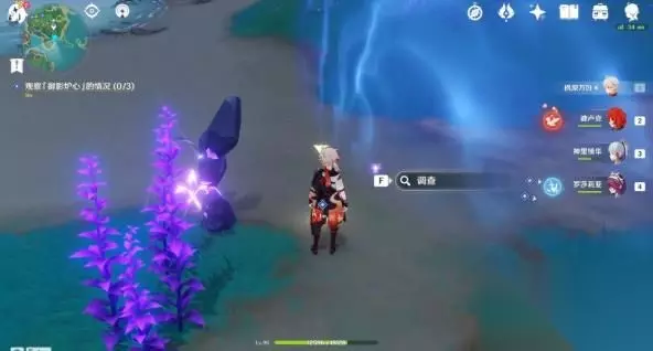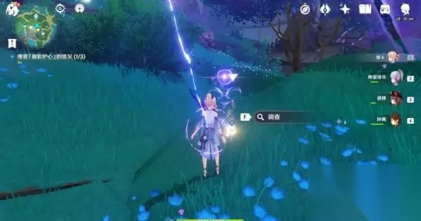 2号点位:需要先触碰半空中的雷灵,触碰几次后雷灵落到地面,就会出现调查点。可以利用旁边的雷樱枝条召唤雷种子,使用雷极飞到空中。 2号点位调查点