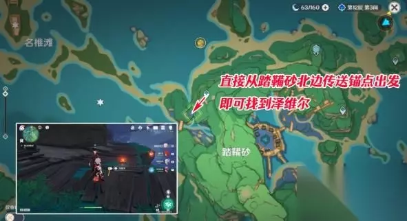 2、寻找泽维尔 按照任务指引,可以在踏鞴砂的传送点附近找到这位大发明家,具体位置及路线如下图所示,与泽维尔对话即可了解到现在的情况。