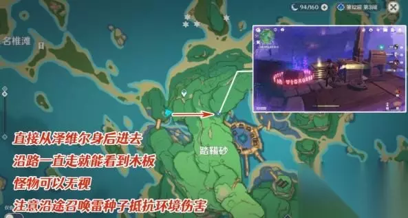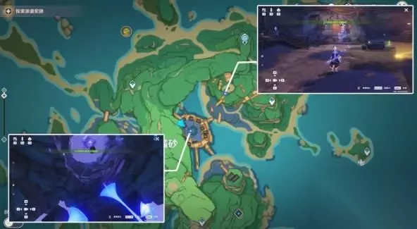 2、寻找丢失的零件(共3枚) 零件所在的位置已经标注在下面的图中了,去拾取零件的图中,会遇到一些怪物,可以直接无视,拿上零件就跑,中途用附近的雷樱枝条召唤雷种子抵挡环境伤害。 零件拾取点样式如下图中所示,附近共有三个,可以开启元素视野方便寻找: