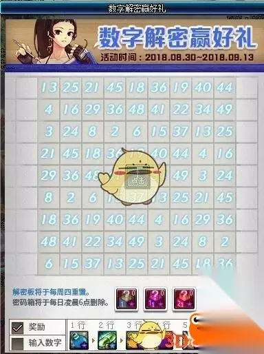 DNF数字解密9月5日答案 正确答案:10 。不知道聪明的小伙伴们有没有猜对呢? DNF数字解密玩法攻略 1、数字解密面板一共由81个格子构成,玩家每次点亮横、竖、斜一排的9个格子,都可以获得一个奖励,当完成8组数字后,就完成了全部的解密任务。 2、在整个表格的中间区域有一个空白格,这里是没有数字的,需要玩家填写。点击中间的问号图标回答暗号,答对暗号后可以点亮中间一格的图标。 3、数字解密题板中最中心的密码是在你重置题板后才会重置,如果你一星期只能玩一轮数字解密的话,那么记录一次答案就行了。 DNF2020活动 欲望之塔