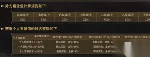 pk赛季结算个人赛季的贡献值结算规则: 贡献值主要的获取途径主要有着三个方面: 1、其他势力的部队交战 2、取敌方建筑耐久 3、占其他势力玩家的土地 而具体的结算奖励如下 个人贡献排名1~100名 势力排名第1名且占领1州府,霸业奖励,金珠*1500 势力排名第2~3名且占领1州府,霸业奖励,金珠*100 势力排名第4~6名或未占领州府,金珠*500 个人贡献排名101-300名 势力排名第1名且占领1州府,霸业奖励,金珠*1000 势力排名第2~3名且占领1州府,霸业奖励,金珠*800 势力排名第4~6名或未占领州府,力战金珠*300 个人贡献排名>300名 势力排名第1名且占领1州府,割据奖励,金珠*500 势力排名第2~3名且占领1州府,力战奖励,金珠*500 势力排名第4~6名或未占领州府,力战奖励金珠*100