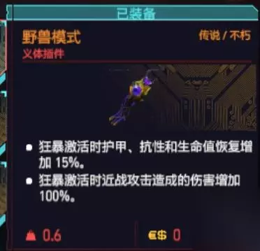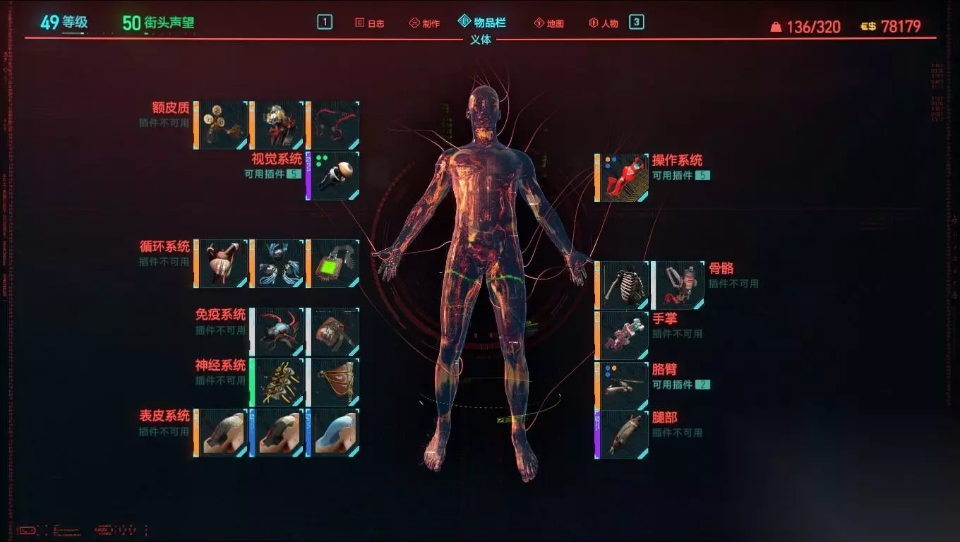 额皮质:边缘系统增强器:暴击率增加25%,需要15智力,日本街的义体医生 机电核心:对无人机,机甲和机器人造成伤害增加50%,需要16技术,北区义体医生 视觉皮质支持:暴击伤害+45%,需要16智力,西风庄园义体医生 视觉系统:歧路司义眼3型,小唐人街义体医生 循环系统:副心脏:生命值降到0时立即回复100%生命,需要16肉体,美泉区义体医生 生物导体:所有义体冷却时间减少30%,需要18肉体,流浪者营地义体医生 生物监测:生命降低到15%是立刻回复100%生命,需要18肉体,流浪者营地义体医生 免疫系统: 看个人喜好(受到加点原因影响,无法用最好的,所以看个人喜好搭配) 神经系统:喜欢当剑圣的玩家建议带时间减缓(受到加点原因影响,无法用最好的,所以看个人喜好搭配) 表皮系统:皮下护甲:护甲增加200,歌舞伎区义体医生 接地镀层:免疫电机效果 防火涂层:免疫燃烧效果 操作系统:军用科技狂暴5型:长按E激活狂暴会大幅增强你的力量和坚韧。武器后坐力降低15%,近战伤害增加15%,护甲和抗性增加15%。持续时间:25秒。冷却时间:60秒。狂暴激活时,从高跳下会发动英雄降临,在高速下落的同时产生足以发出冲击波的威力,对附近的敌人造成伤害。狂暴激活时击败敌人可以恢复最大生命值的5%。狂暴激活时生命值增加40%。狂暴激活时最大耐力增加40%。(需要18肉体,宪章义体医生) 其中有个重要的插件如图: