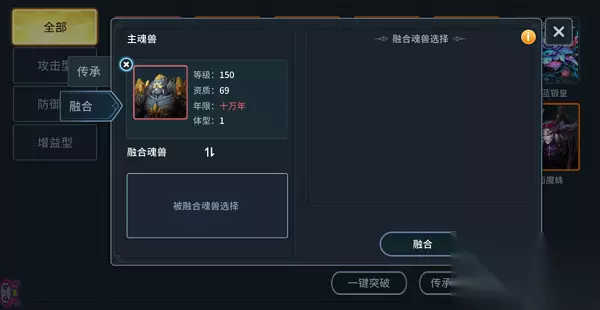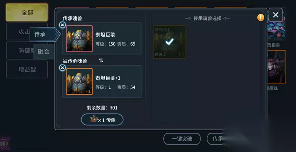 魂兽的传承也就是传承与被传承魂兽两者之间的等级置换,但相应的资质、技能不会进行置换,且仅适用于同种类型的魂兽传承。(也就是说攻击型魂兽不能和增益型、防御型魂兽间进行互相的传承)