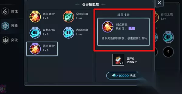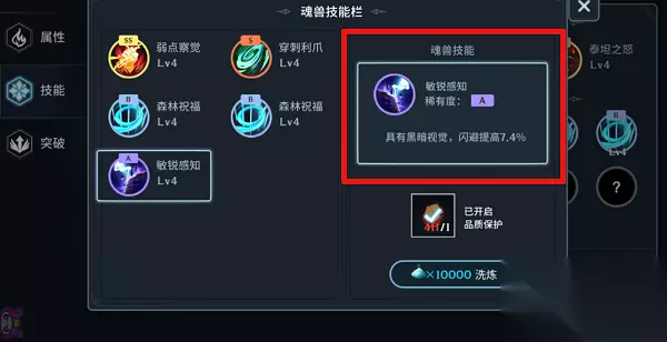 此外魂师大人们还可以通过洗练附加在魂兽身上,获取更强力的加成效果。这些技能品质排序对应为:E、D、C、B、A、S、SS,即SS品质的魂兽技能点最高。由图可知,进行洗练前后,魂兽技能的改变: