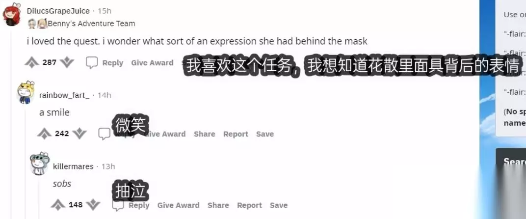 不少玩家也心疼起了花散里小姐,不得不说,我们全程没能看见她面具下的表情,这着实让人感到有些落寞呢。而她唯一的遗物(狐狸面具)在被使用后虽可化为武器图纸,但仍有不少玩家选择将其永久珍藏;当然,如果能把它当成配饰来戴在头上那就更好了。
