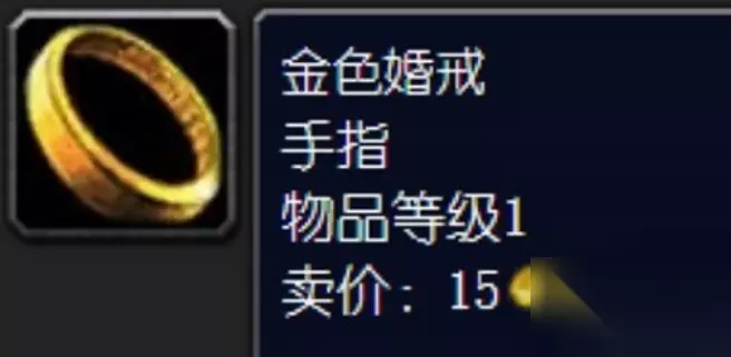 1、魔兽世界中,这个金色婚戒相当于是杂物,主要就是拿来卖钱的。 2、放到商店里直接卖了也有15金,价格不俗,而且放交易所可能还可以卖出更高的价格。 3、金色婚戒可以通过钓鱼来获取,钓鱼有几率钓到钓鱼宝藏,开启宝藏就有概率出金色婚戒。 4、当然,除了直接卖出外,也有一些玩家会在游戏中泡妹子,可能会拿金色婚戒送给妹子。 5、不过因为这款游戏并不是主打这方面社交的,所以几乎遇不到这种玩家,而且送了也只是一个象征而已。