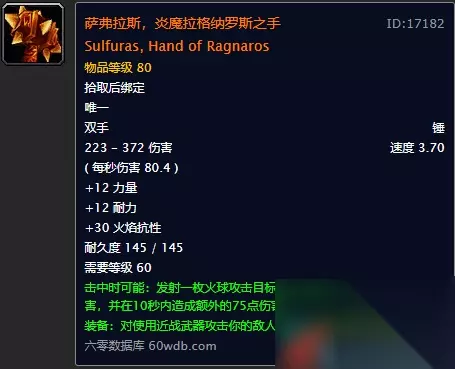 ID:17182 Sulfuras, Hand of Ragnaros 物品等级 80 拾取后绑定 223 - 372 伤害 速度 3.70 每秒伤害 80.4 +12 力量 +12 耐力 +30 火焰抗性 耐久度 145 / 145 需要等级 60 击中时可能:发射一枚火球攻击目标,对其造成273到334点火焰伤害,并在10秒内造成额外的75点伤害。 装备:对使用近战武器攻击你的敌人造成5点火焰伤害。 制作方法: 萨弗隆战锤+萨弗拉斯之 别看就两件,这两件东西的获取难度可不小。