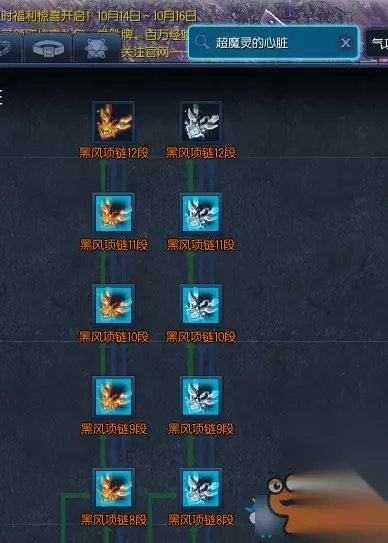 最后说一个装备成长树的便利地方,顶上的搜索,你可以输入材料名,这样在查询界面就会有蓝框提示你,有哪些装备是需要这个材料的。