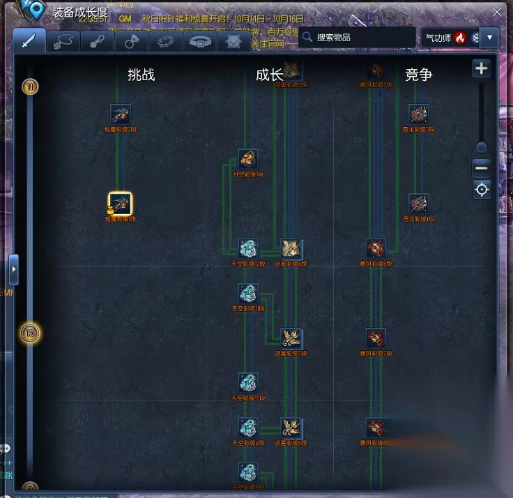这个系统是方便玩家更加直观的了解装备之间的关系,如何选择装备,以及如何晋级装备。 如上图所示,武器这一界面,分了三个栏目: 1.挑战(外传武器:烛魔,昆仑) 2.成长(主线武器:无形,天空,时空,星云) 3.竞争(PVP武器:暴风,苍龙) 可以看见的是,武器与武器之间有不同的箭头指向,这代表的是武器的成长方向。当你将鼠标放到线路上是,你能看见一个便捷的小提醒: