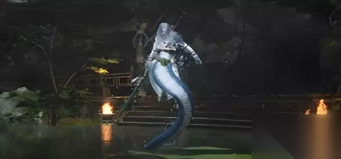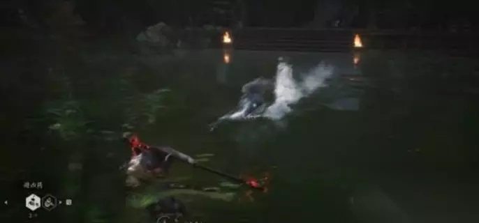 3、长枪斜方斩(攻击距离较远) 应对讲解:属于二阶段的另一个白给招式,没有别的动作衍生技,躲过之后直接贴身输出即可,并且没有后续跟进动作,可以稳定贪一套轻击6连。 错误应对方法是远离攻击距离,因为该招式发出时,白衣秀士的枪尖会有一段水花包裹,攻击距离比显示的远一点。