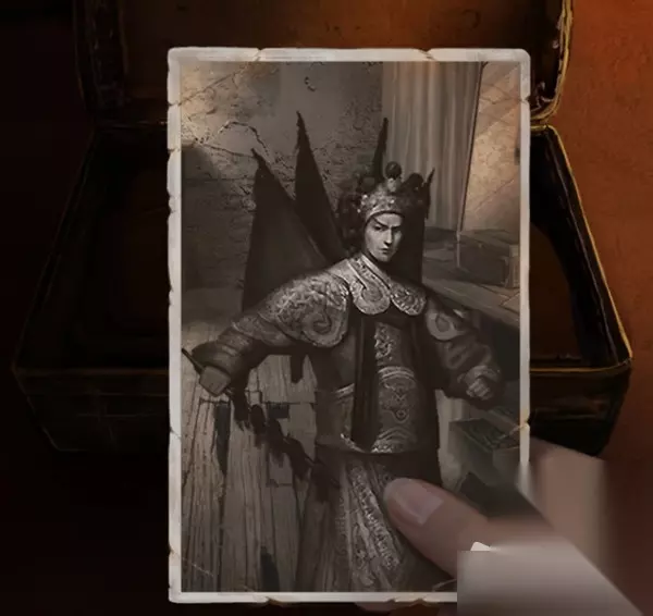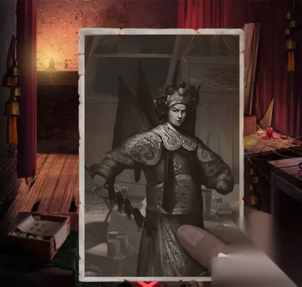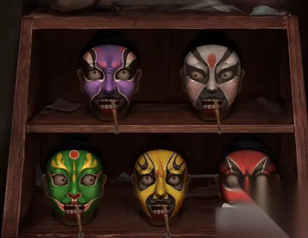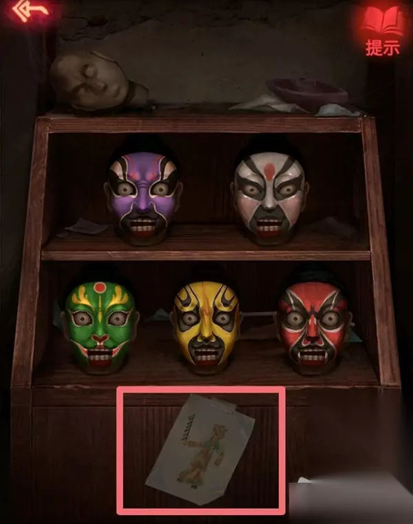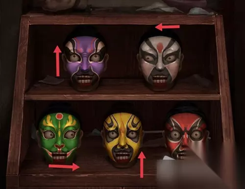 7.回到场景一,摆好脸谱的顺序,如图所示(摆好后有个脸谱睁眼小高能),点击下方的图纸,获得皮影的图纸